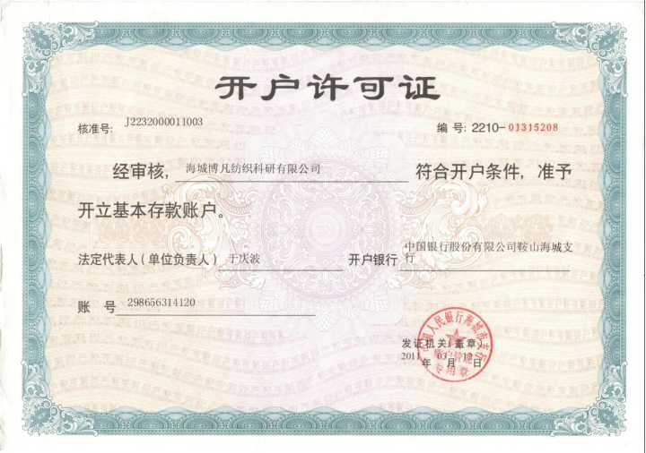 海城博凡紡織科研有限公司 開戶許可證